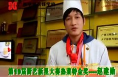 赵建勋 赵建勋, 广西华南烹饪学校 金牌大厨111 班 ,参加学校第 19 届厨艺新星大赛荣获热菜组特金奖,作品名:《七彩葫芦》。 获奖感言:这次我拿了这个奖,主要是班主任朱伟老师的点拔,还有同学们的交流给了我很