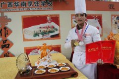 吴荣华同学是广西华南烹饪学校大厨精英113班的学生,在第19届厨艺新星大赛中,获得拼盘组的特金奖,获得奖金500元。 吴荣华,来自大厨精英113班的学生,参加了华南第19届厨艺新星大赛,获得了(拼盘组)特金奖,奖金